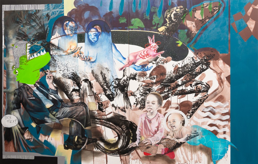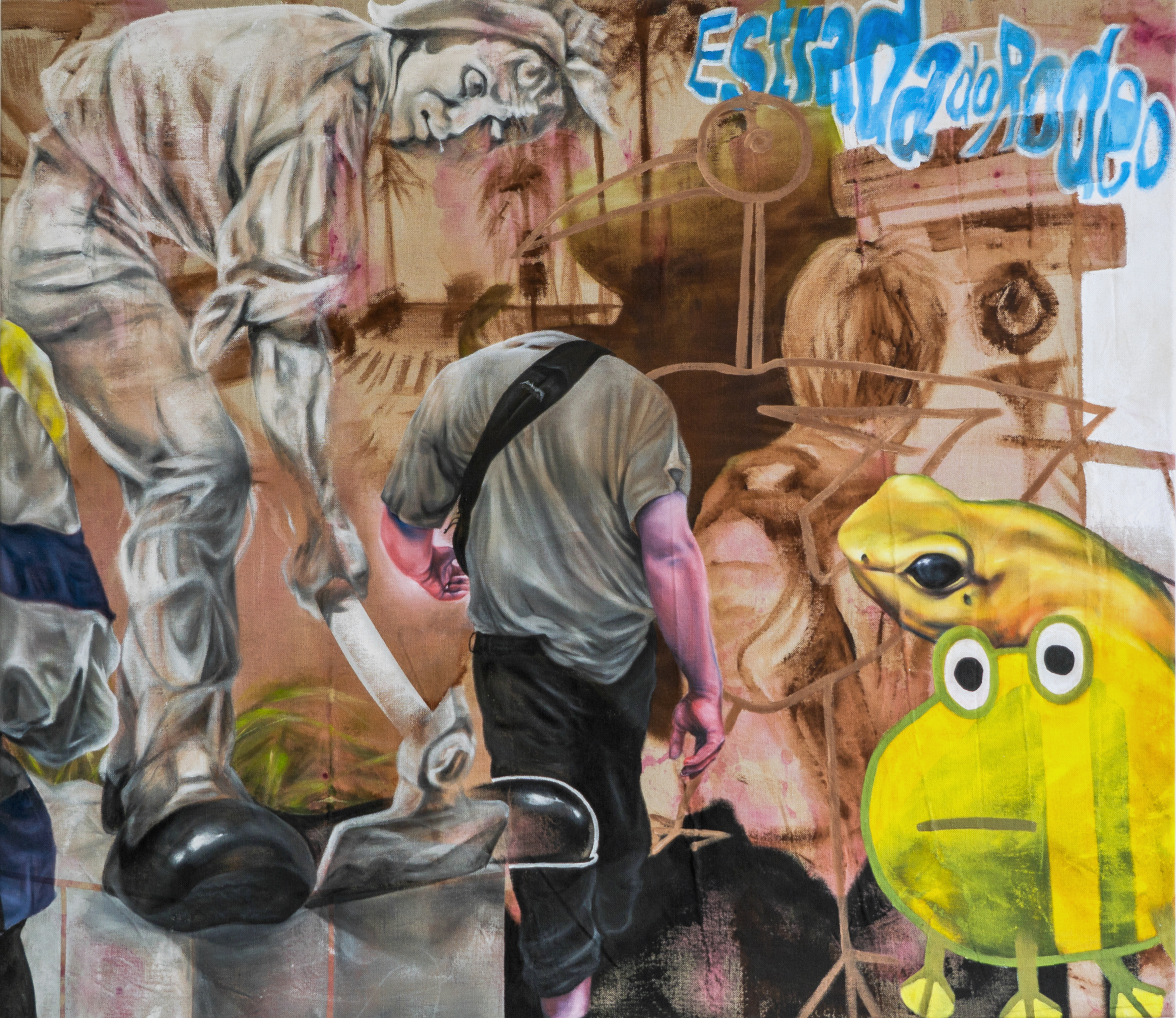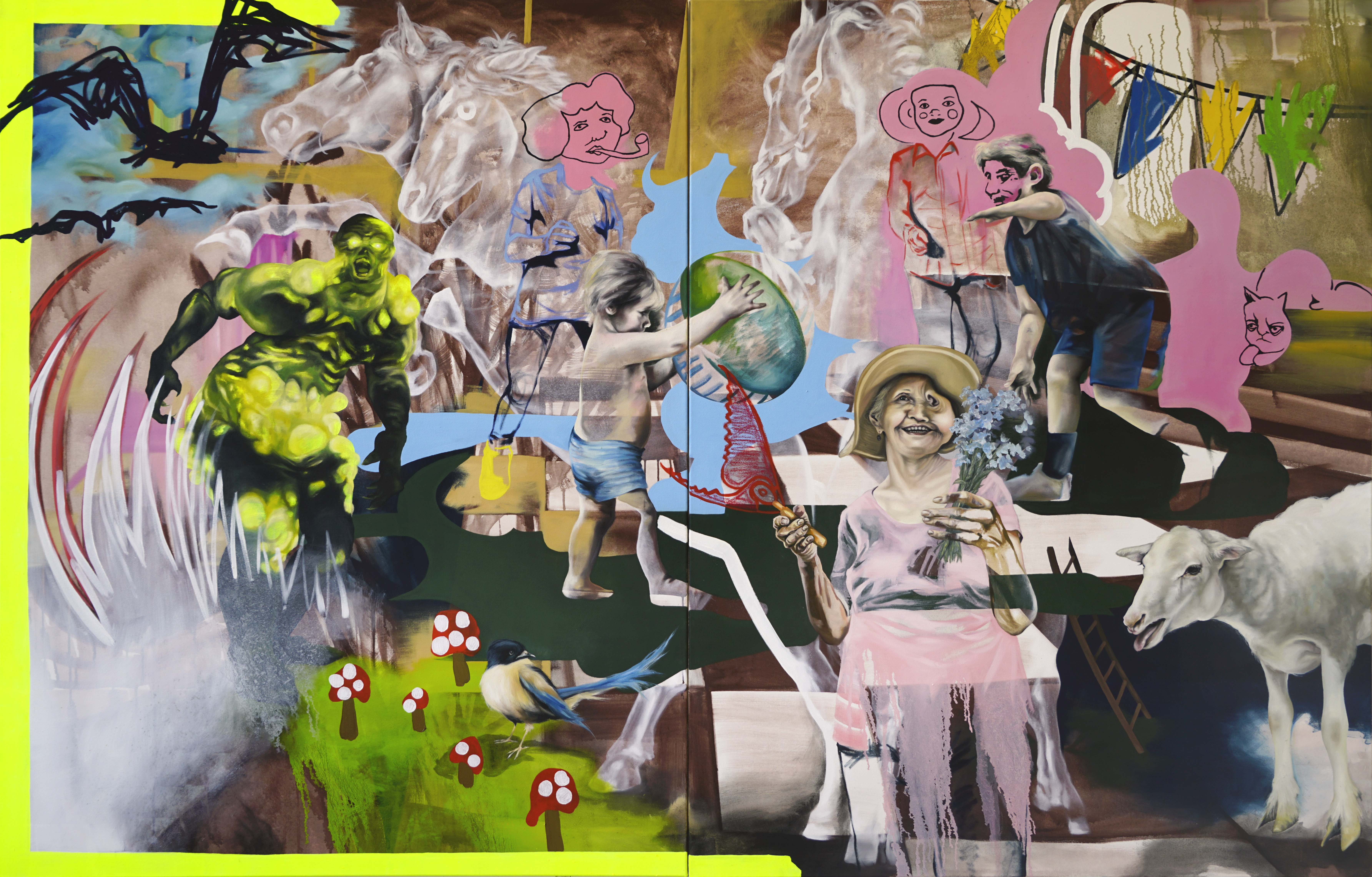 TROJA, 180 x 280 cm, Oil, Acrylics, Spraypaint and Crayons on CanvasWE CAN NOT HAVE THIS CONVERSATION AGAIN, 160 x 120 cm, Oil, Spraypaint and Acrylics on CanvasSELBST MIT MENSCH, 180 x 80 cm, Oil, Acrylics and Crayons on CanvasESTRADA DO RODEO, 125 x 145 cm, Oil and Acrylics on CanvasTONDO, 40 cm, Oil and Acrylics on CanvasSNAIL, 60 x 50 cm, Oil and Acrylics on CanvasMANTIS, 70 x 50 cm, Oil and Acrylics on CanvasBAD RABBIT II, 70 x 60 cm, Oil, Acrylics, Spray paint and Crayons on CanvasBAD RABBIT, 70 x 50 cm, Oil and Acrylics on CanvasFISHERMEN´S WIVES, 100 x 70 cm, Oil and Acrylics on Canvas
