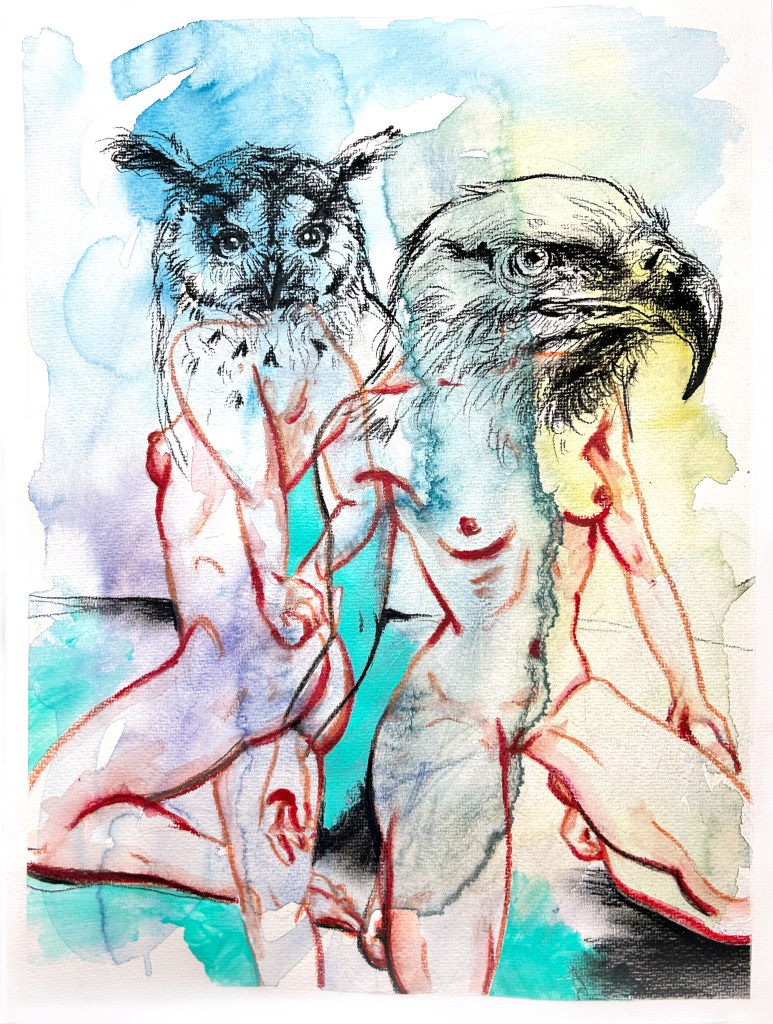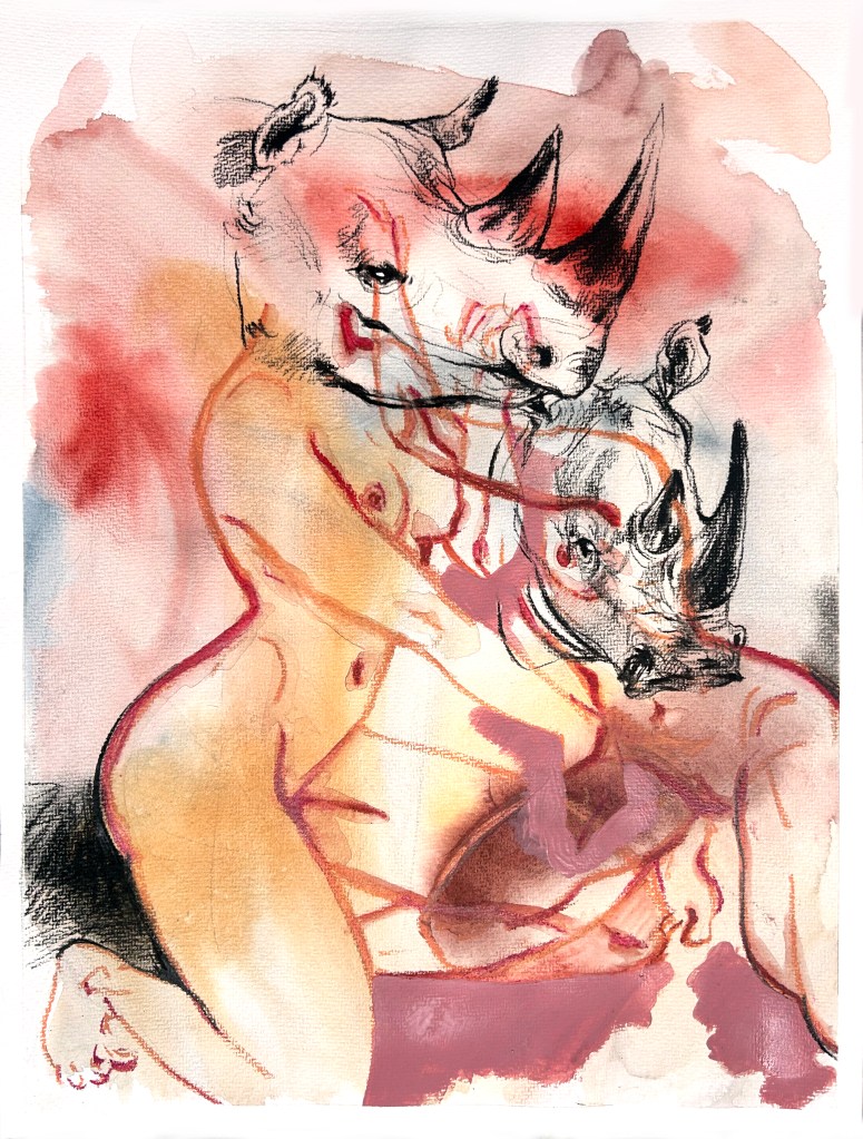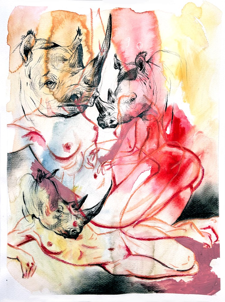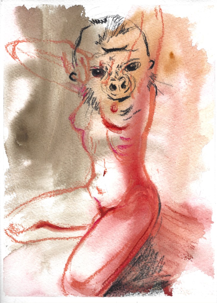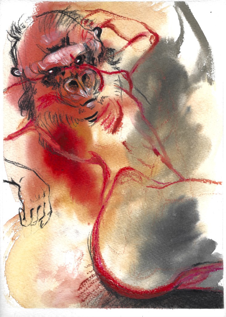 NEC (never ending consent), mixed media on watercolor paper, 48 x 36 cmGGG (go gorilla girl) II, mixed media on watercolor paper, 32 x 24 cmGGG (go gorilla girl), mixed media on watercolor paper, 32 x 24 cmNEC (never ending compromises), mixed media on watercolor paper, 48 x 36 cmFAF (forever and further), mixed media on watercolor paper, 48 x 36 cm
